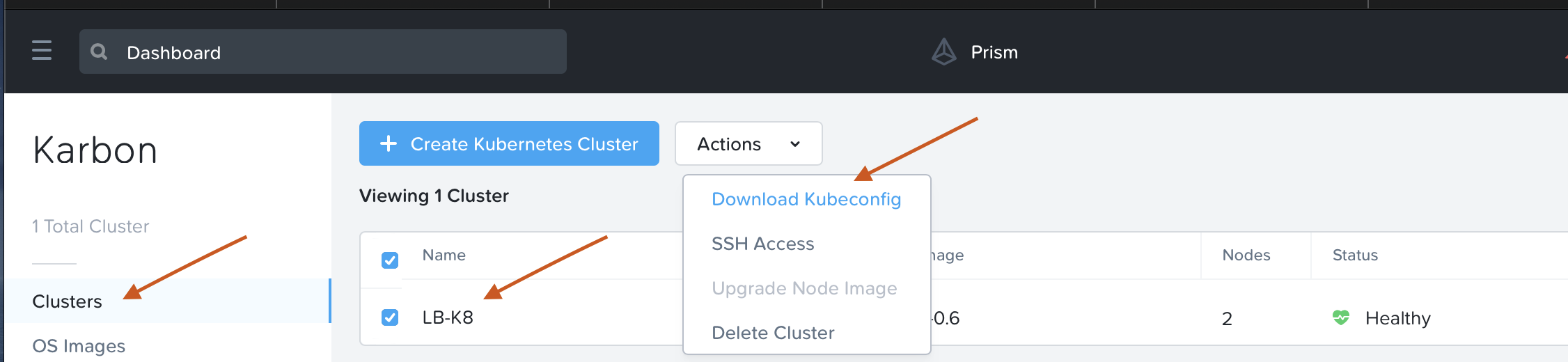 Click on Actions > Download Kubeconfig